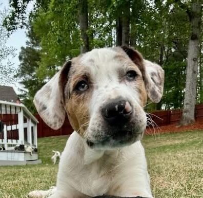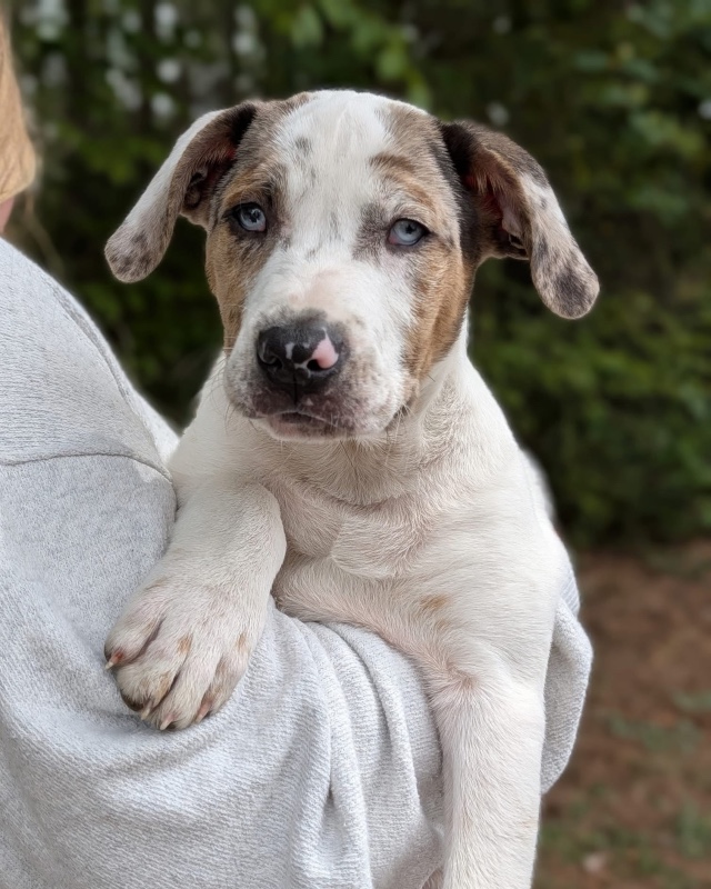 From his rescue advocate: Arrow’s story began when we rescued a Merle mama dog and her puppies from a hoarding situation in Alabama. We fostered the mom and pups for the first 8 weeks. At about 6 weeks old it became apparent that 3 of the puppies are deaf, leading us to believe it was likely a “double Merle” breeding. Mom looks like a catahoula mix (55 lbs) and we were told dad is an Aussie. It is possible for double Merle dogs to have someone visual impairments, too.
