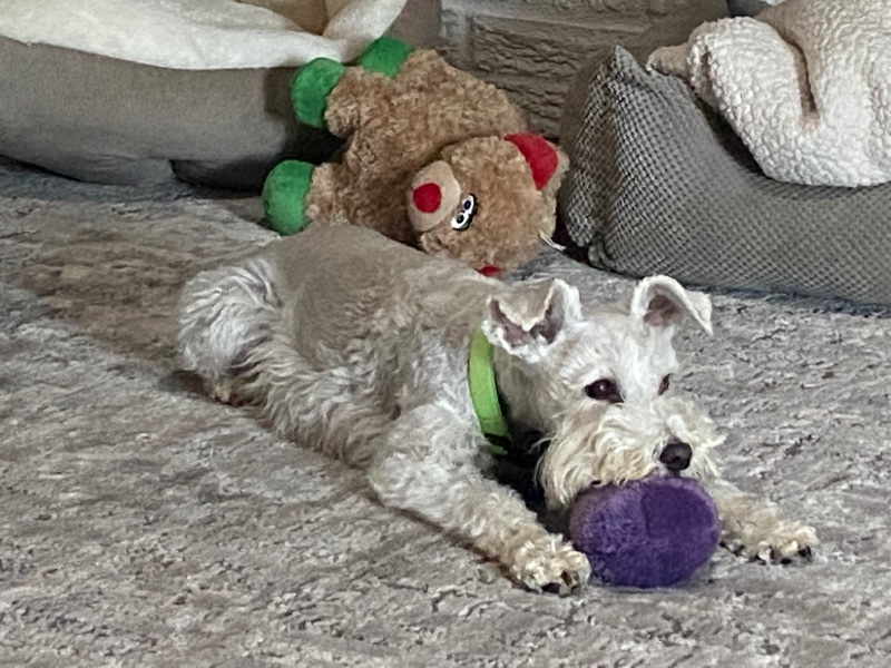 From his current caregiver: Billy is a 12yr, 16 pound healthy miniature Schnauzer He is crate trained, house trained and proficient at doggy door use. Has never had an accident in the house since we rescued him at 9 months. He eats mostly 2x day goes for walks or rides most days. A good watchdog, and barks some but not so great on leash as he sometimes reacts badly to other dogs and fast moving objects. We are rehoming him due to our health and the fact my husband doesn’t care for him any more Billy is the last of our 4 schnauzers. We both are in treatment for cancer. I feel Billy has lots of good years left with the right person or family.