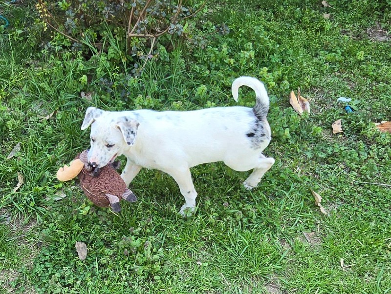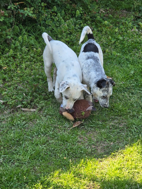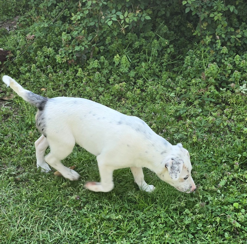 From his rescue advocate: Greyson came to me as an owner surrender when he was about 6 weeks old along with 8 siblings. He is 16 weeks old now and weighs about 20 lbs. He gets his name because of his big grey spot around his tail and on his ears. He has one half moon blue eye. He’s had 3 rounds of vaccines, dewormed, and is on Nexgard Plus. He has not been neutered yet. We spay/neuter all of our dogs before adoption is 100% complete. Greyson was adopted (on a foster to adopt basis) and returned recently when his adopter noticed he wasn’t able to hear while training with cattle. I had absolutely no clue. Greyson has always been just a happy go lucky puppy showing no signs of being deaf. He is very energetic.