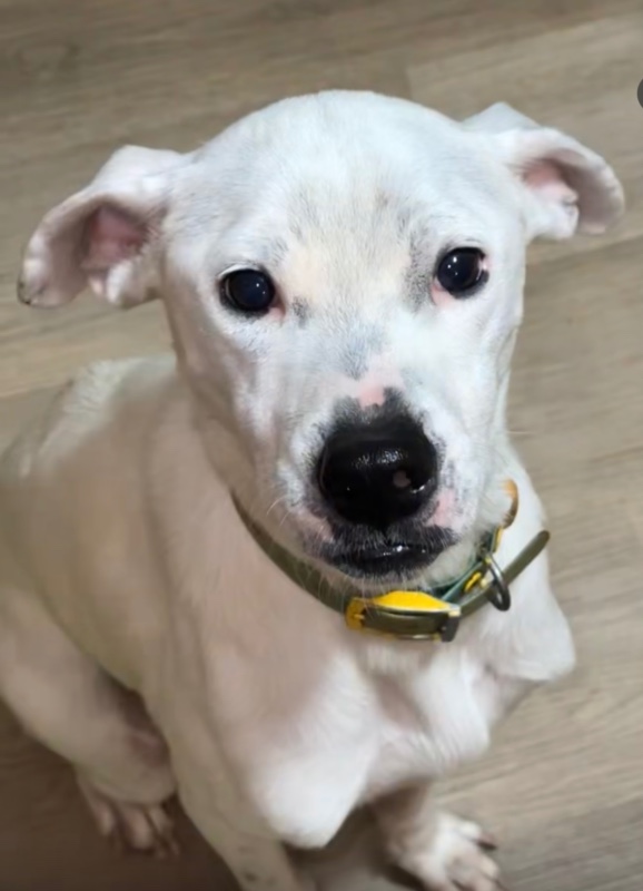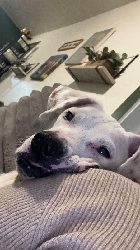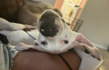 De son soignant : June est une chienne sourde de 2 ans au grand cœur. Elle a été trouvée alors qu’elle était un chiot dans une benne à ordures au Nouveau-Mexique et est devenue un chiot doux et aimant qui adore tout le monde et les chiens.
