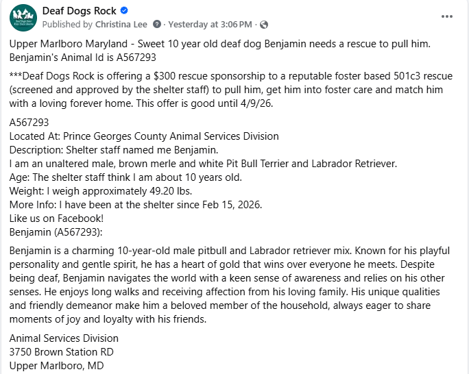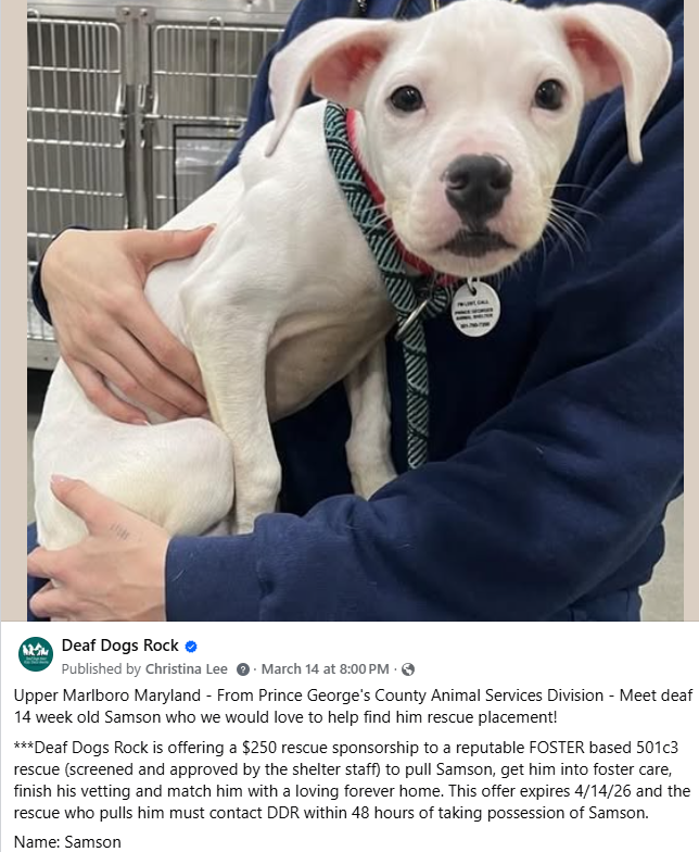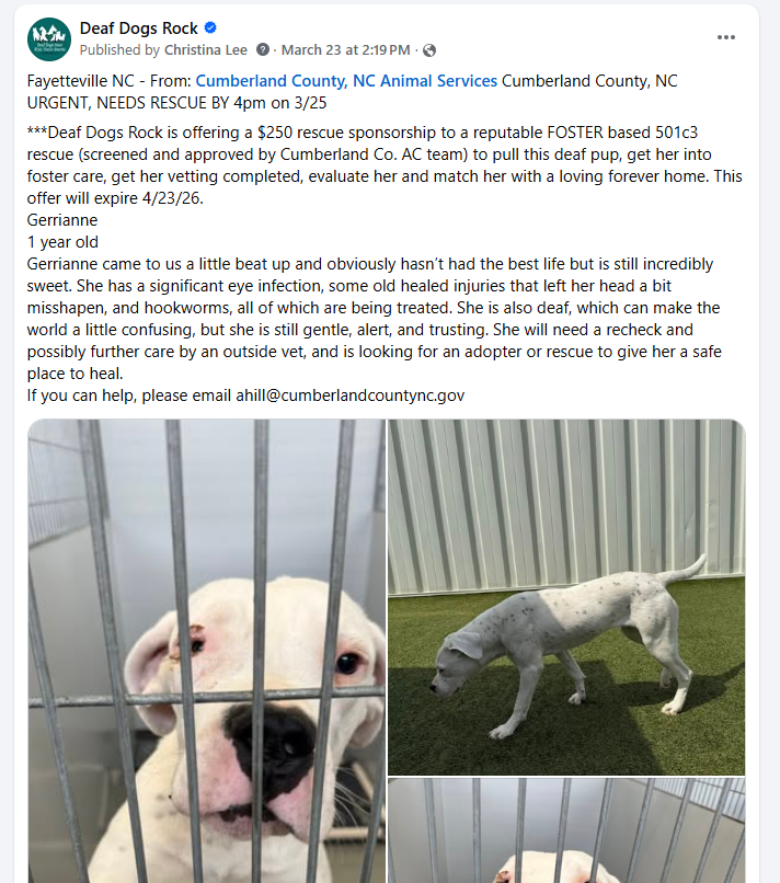 Every single day on our Deaf Dogs Rock FB page you will see us put up Rescue plea posts and offer of rescue sponsorship funding for each deaf dog in need hoping to find rescues who can take the deaf and deaf/blind pups. We share deaf and deaf/blind dogs that are currently be held in shelters across the country trying to get deaf dogs out of over crowded shelters before they are euthanized to make space for more intakes. Sometimes a deaf dog who is surrendered only has a day or two for the opportunity to be pulled by a reputable foster based rescue. For this reason you will see our organization Deaf Dogs Rock offer $250-$300 (urgent medical can go up to $400 to $500) rescue sponsorship on almost every rescue plea we post up on our Deaf Dogs Rock FB page. By offering a rescue sponsorship we encourage rescues to help a deaf dog in need. Without the financial sponsorship offers to help with each deaf dog’s vetting expenses, many of the deaf shelter dogs would parish and surely die within a few days.