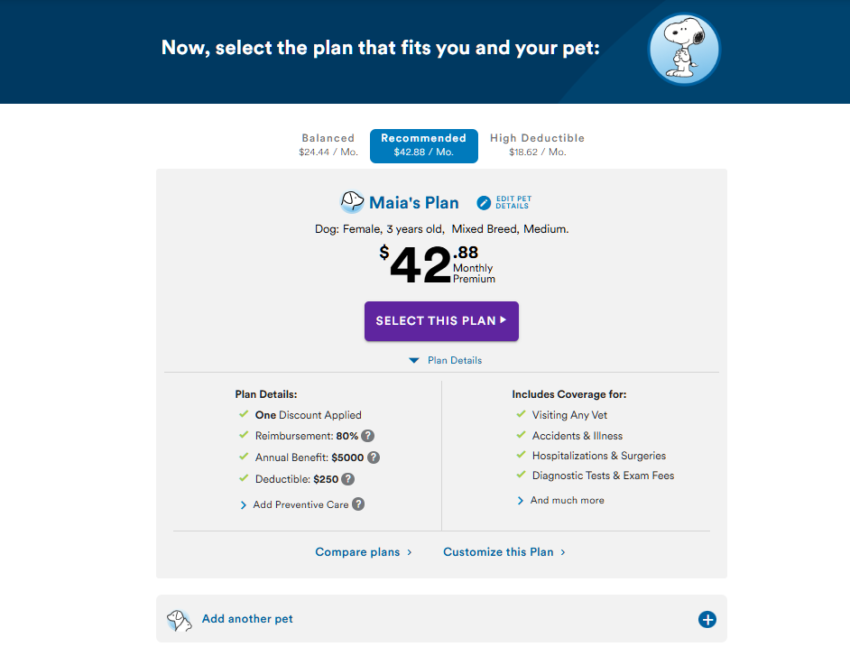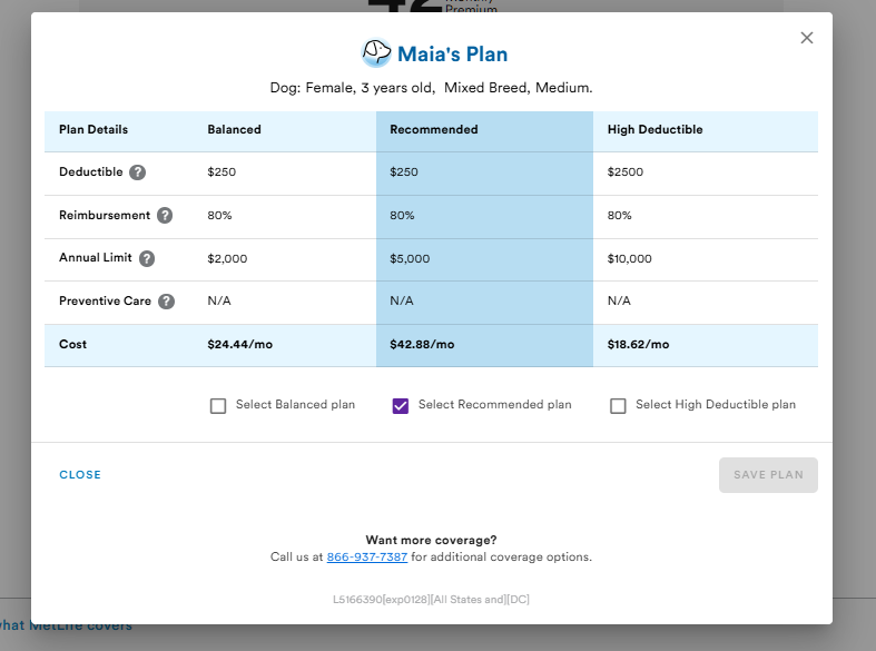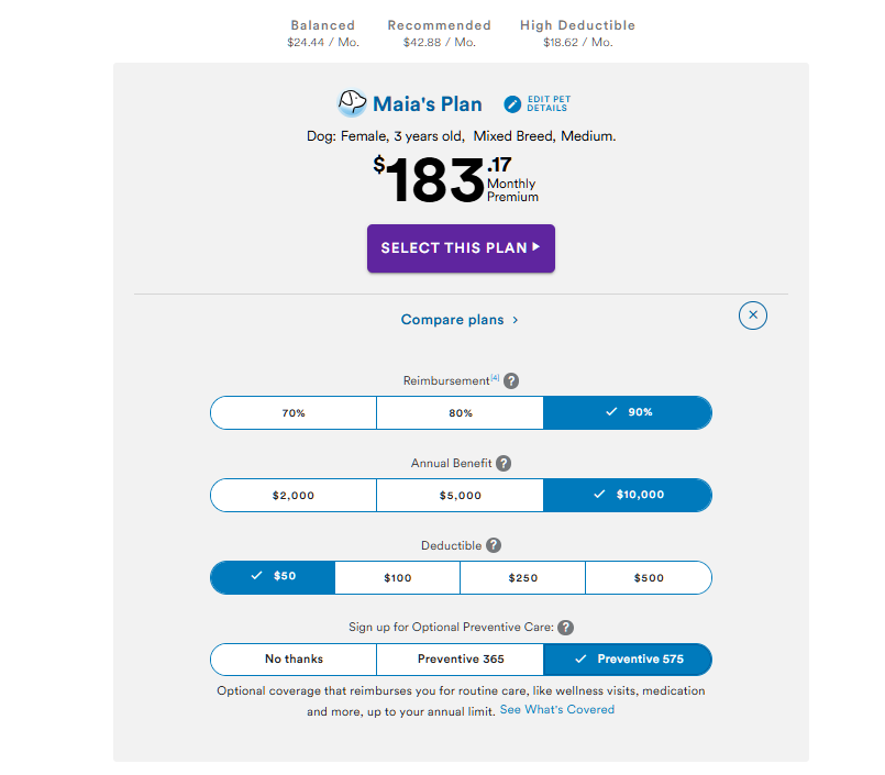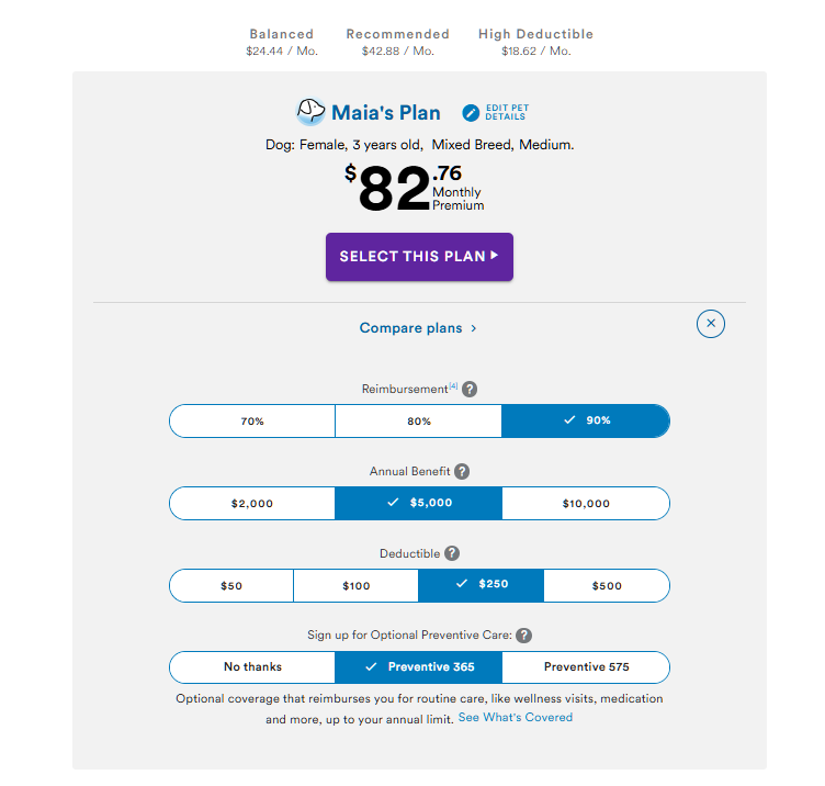 Before we head into my final thoughts, I figured it may be helpful to see quotes for a few different breeds and ages. Each of these is the monthly cost for the recommended plan. All are female.