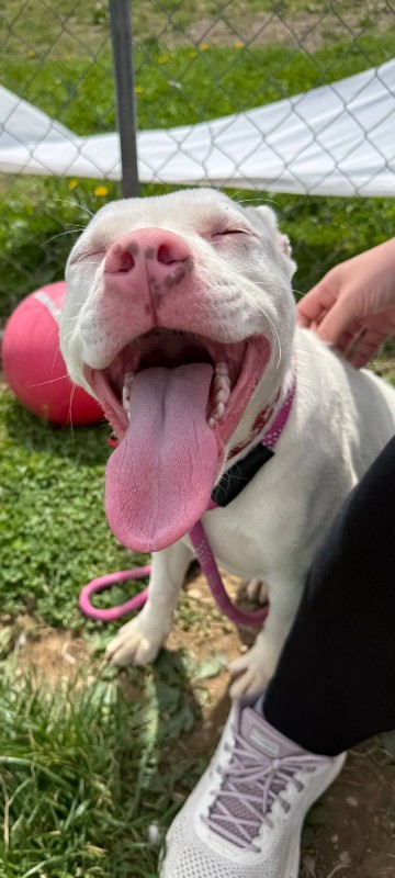 Pearl is an 8 month old pittie with a stunning look. Her personality is kind and sweet.